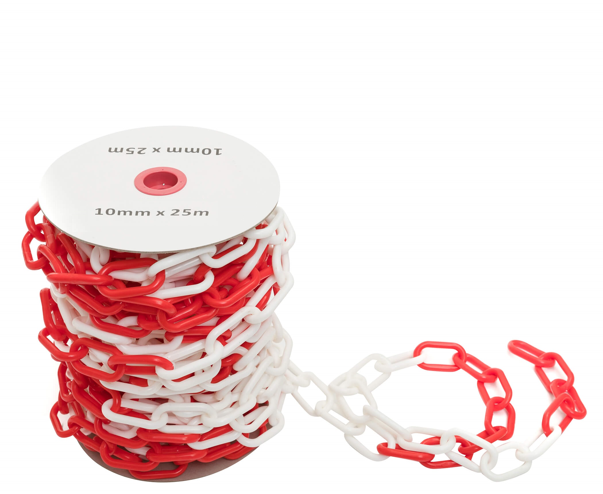 Высококачественная пластиковая оградительная цепь и карабин сигнального красно-белого цвета. Диаметр звена: 10 мм; бухта: 25 м.