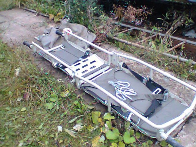 Носилки представляют собой металлическое, складывающееся по поперечной оси устройство многократного использования.
